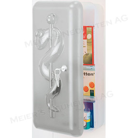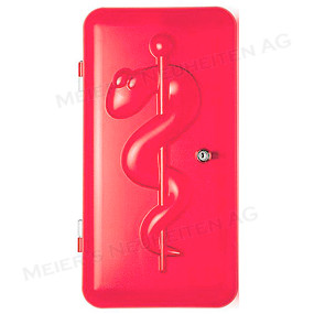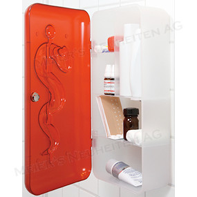 Selbstverständlich ist dieser Erste-Hilfe-Schrank gegen den Zugriff neugieriger Nachwuchs-Chirurgen sicher abschliessbar. Im Inneren bietet er eine praxisgerechte Aufteilung für kleinteiliges Verbandmaterial aber auch für höhere Gegenstände wie Hustensaftflaschen oder Salbentuben.