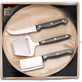 Naturholzbrett mit Käsebestecken für Hobelkäse, Hartkäse und Weichkäse. Brett Ø 25cm. Galvanische Beschriftung bis 40 x 15mm auf das grosse Messer. Das Set ist in einem Geschenkkarton mit Klarsichtdeckel verpackt.