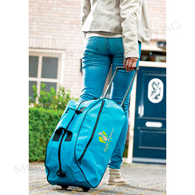 Solide und kompakte Tasche auf Rollen aus 600 D Polyester mit verstellbarem Schulterriemen, ausziehbarem Teleskopgriff und zwei Handgriffen.