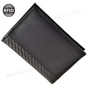 Bemerkungen: Ob Kreditkarten, Personalausweise oder biometrischer Pass: RFID-Chips (Radio Frequency Identification) stecken heute in den meisten Karten und Ausweisen. Dieses Etui ist mit einem speziellen Futter ausgerüstet, das den RFID-Chip vor unberechtigtem Scannen schützt.