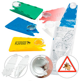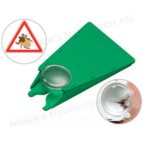 Bemerkungen: Zeckenentferner mit Lupe für komfortables und sicheres Entfernen von Zecken, klappbar, daher besonders geignet für Mailings.