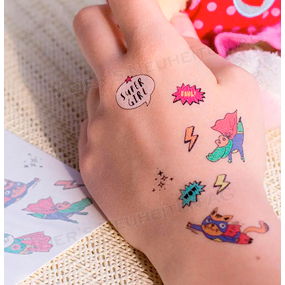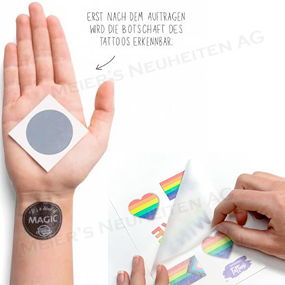 Bemerkungen: Klebetattoos einfach mit Wasser aufzubringen 2-6 Tage auf der Haut haltbar, Schweiss- und Wasserfest, mit Organics Papierabdeckung, 100% Vegan, wird regelmässig dermatologisch getestet. Ob auf Events, für individuelle Promotionkampagnen oder als kreatives Give-Away – Klebetattoos bieten vielfältige Einsatzmöglichkeiten für jegliche Altersgruppen.